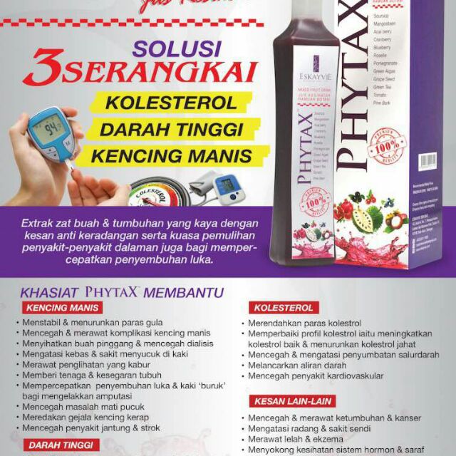 Eskayvie Phytax - Jus Kesihatan Terbaik. Alhamdulillah dgn izin Allah setelah mengamalkan produk PHYTAX bacaan darah tinggi sblm ni 220130 turun kpd 12070. 40200 Shah Alam Email.